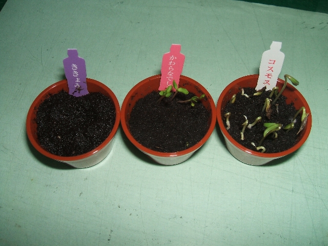 『かわらなでしこ』、そして『ききょう』です。よく見ると『ききょう』は芽が出ているようにも見えますが・・・。